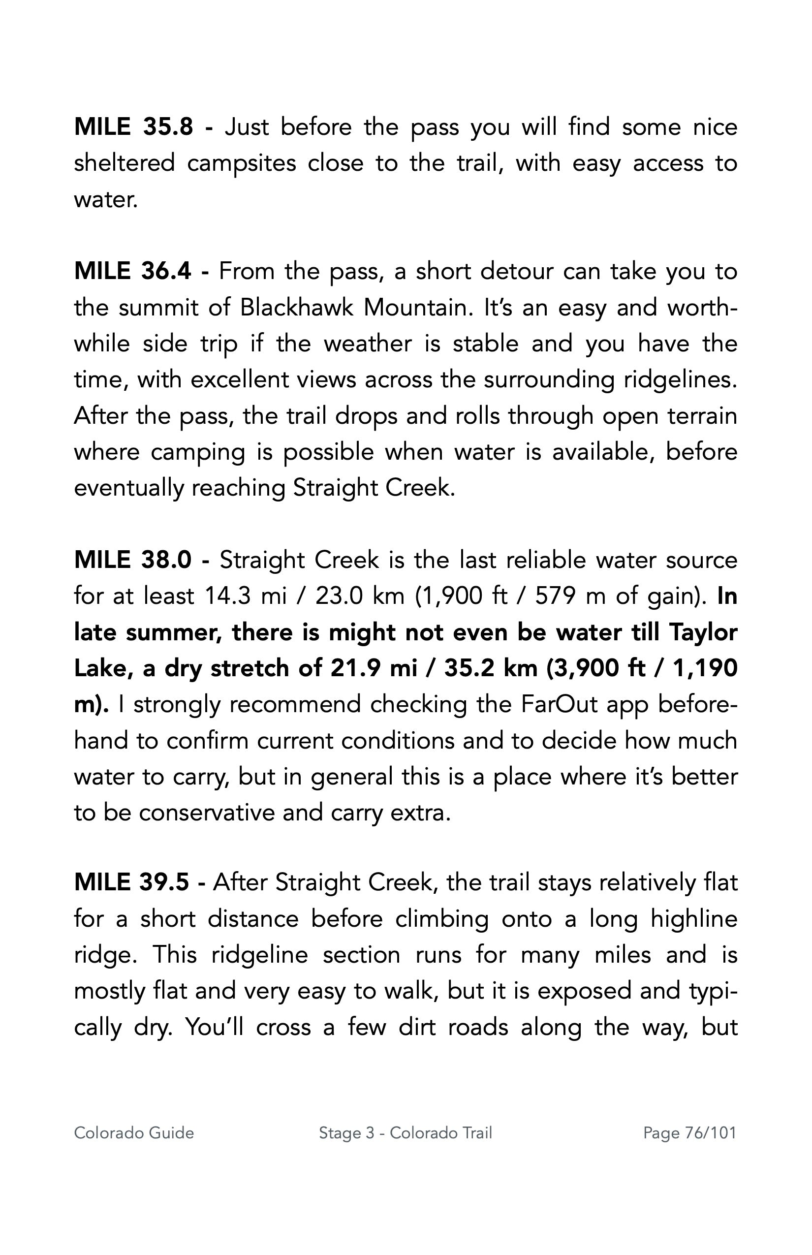 • Detailed stage-by-stage descriptions with distance, elevation, water notes, and camping suggestions