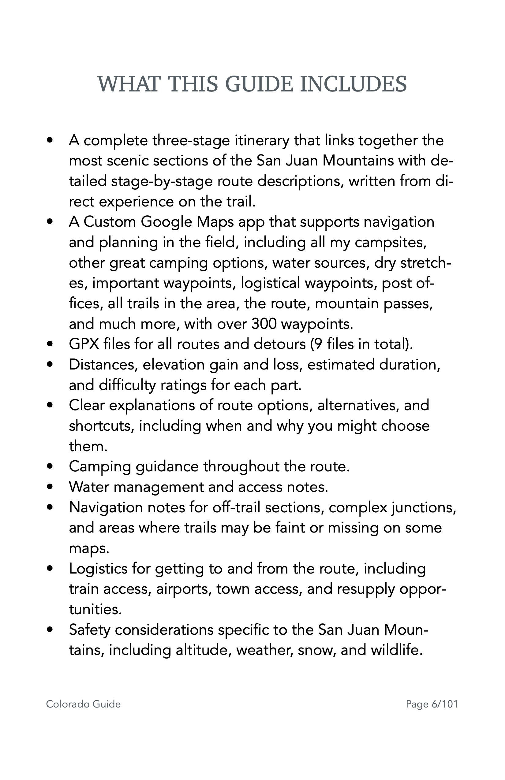 This guide is built around one long traverse, split into three distinct stages. Together they form a complete two-week journey through the heart of the San Juan Mountains, but each stage can also be hiked on its own. Every section is described in detail, stage by stage, with distances, elevation gain and loss, camping notes, water considerations, and navigation guidance.