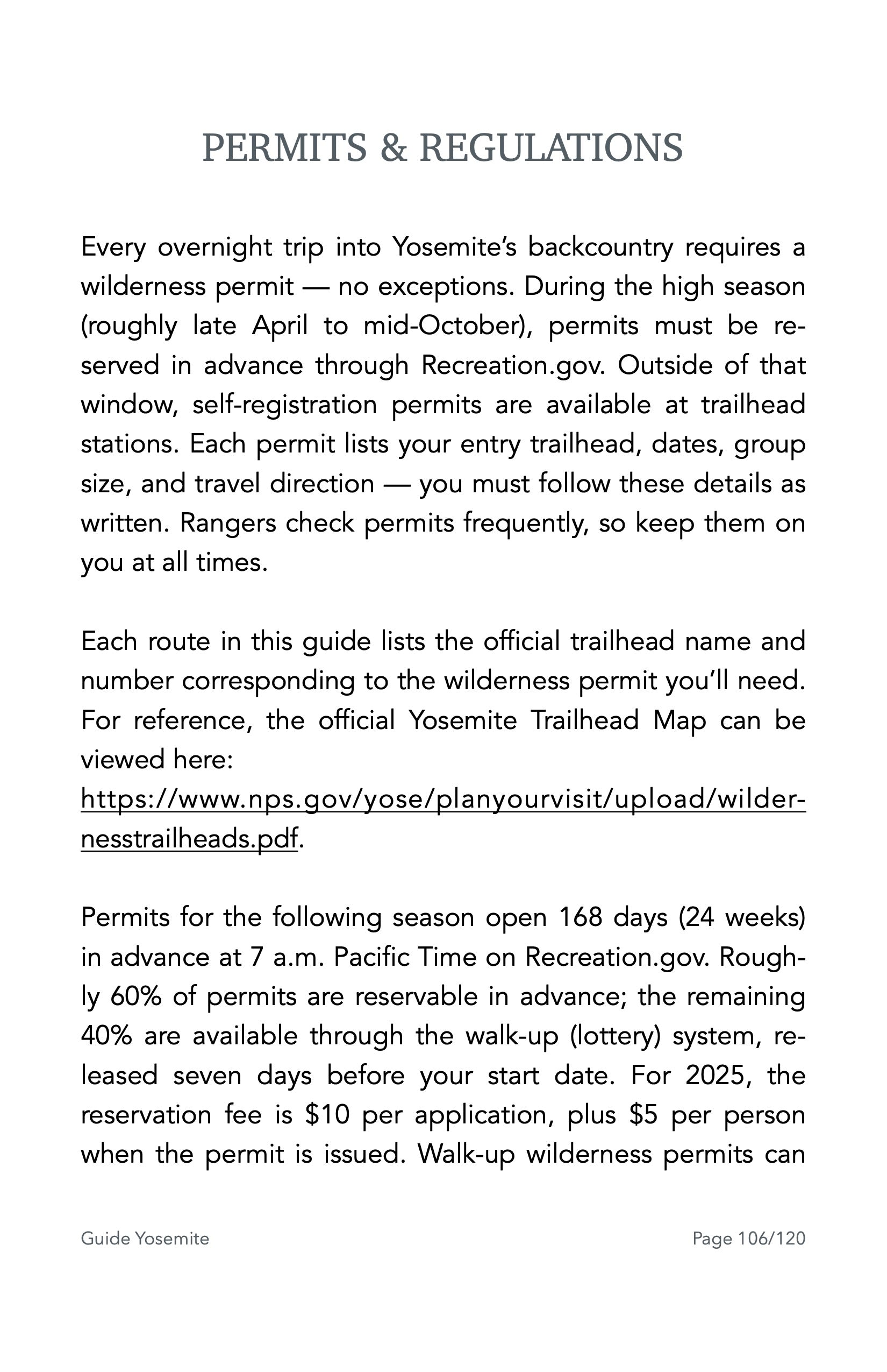 This guide includes five complete multi-day routes, from short overnights to long wilderness traverses across the park’s highest passes. Each one is described in detail, stage by stage, with distances, elevation, camping notes, and navigation tips. They can be done on their own or combined into longer expeditions through Yosemite’s high country.